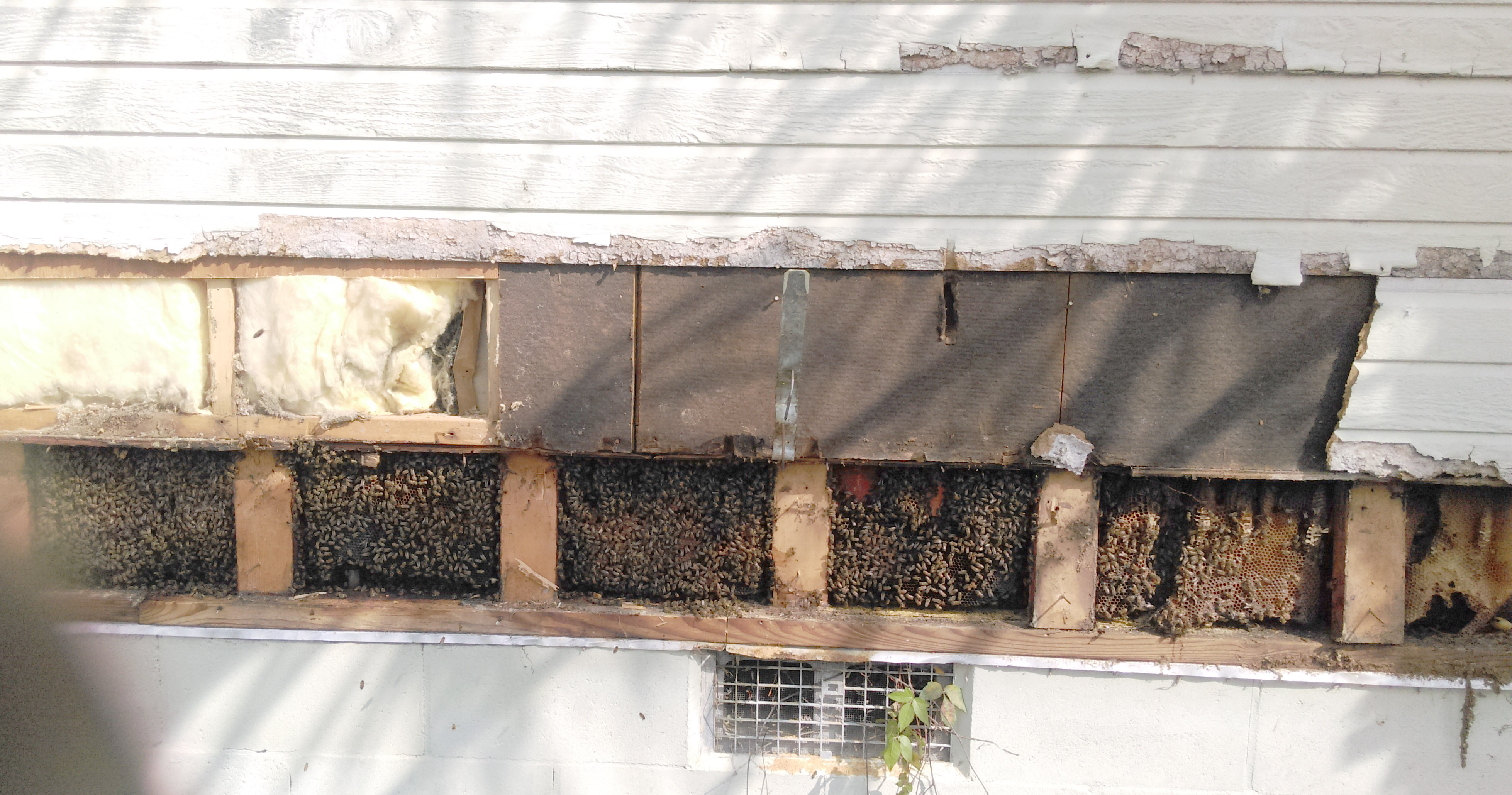 3/2/2018 – An outside hole in the wall of a house had bees coming and going. Removing a piece of siding and then a 2X10 board revealed the bees had been there for some time because the comb and bees extended for considerable distance along the wall joists. We had to revisit the site a few days later to remove the remaining bees and were successful in finally capturing the queen which was in the center of a ball of bees that had gone under the house in the crawl space. All in all this was one of the toughest removals we have done because of the work required to access all the comb and finally capture the queen. Total removal time on site was over 7 hours.