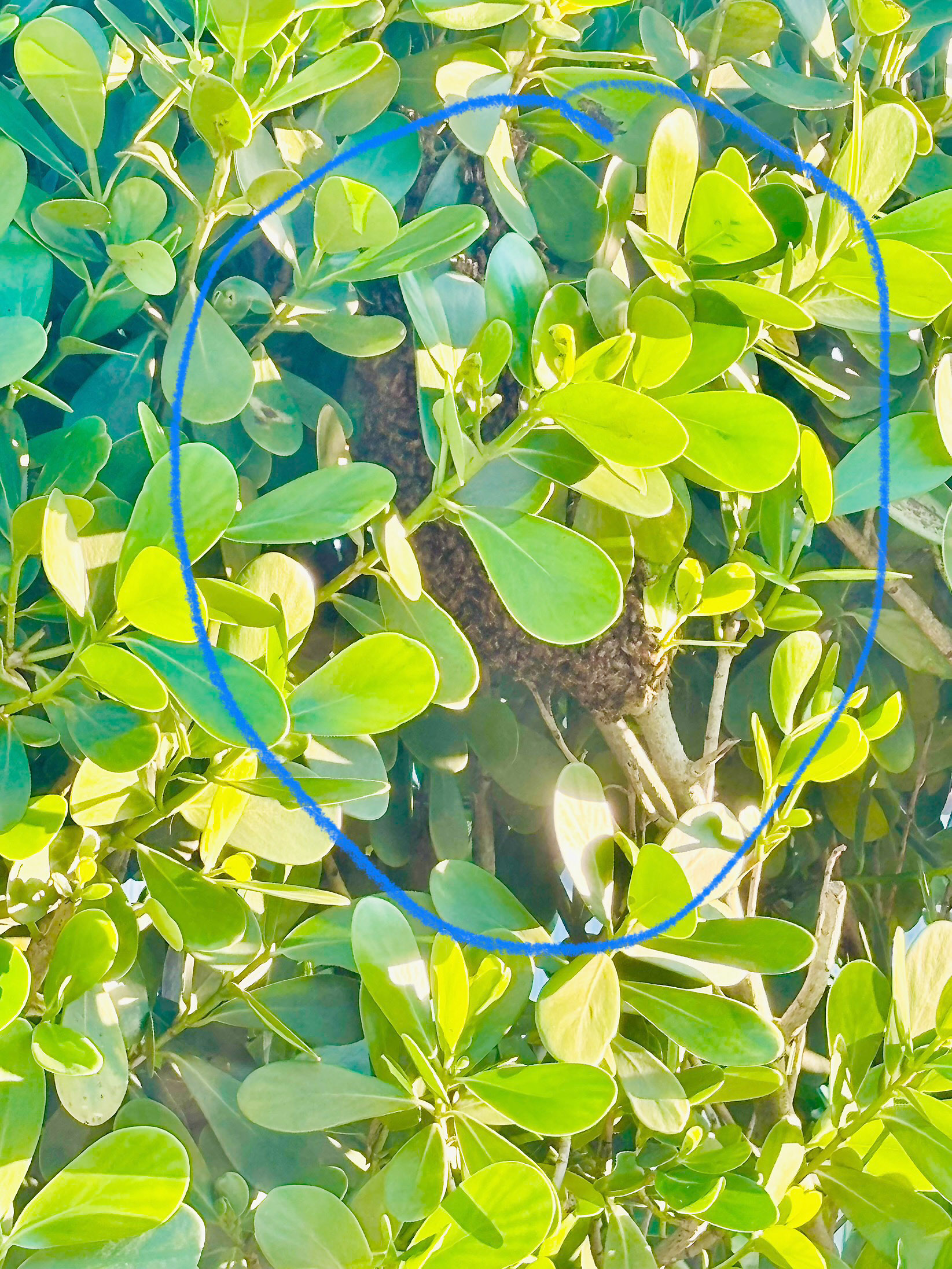 11/23/2025 – A swarm in a hedge at a 26th Place SW Golden Gate city apartment complex was removed. Two hedge branches were cut and the complete swarm was placed in a brood box with a few frames of comb. The box was then transported to the NaplesBees apiary. Hopefully, the swarm will decide to stay and build a hive.