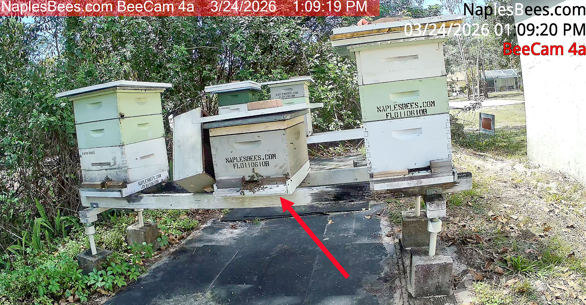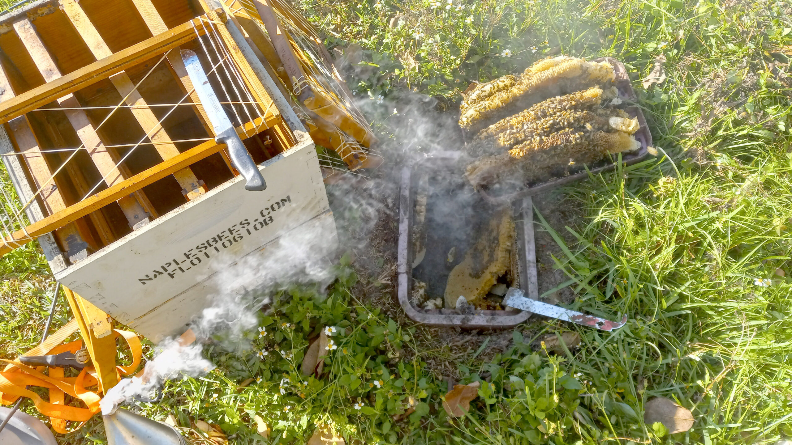 3/24/2026 – A very large hive was removed from a water meter on 8th Avenu North in Naples. All the comb was cut out and rubber band frame mounted in to a brood box. Remaining bees were beevaced in to the hive box tand then transported to the apiary.