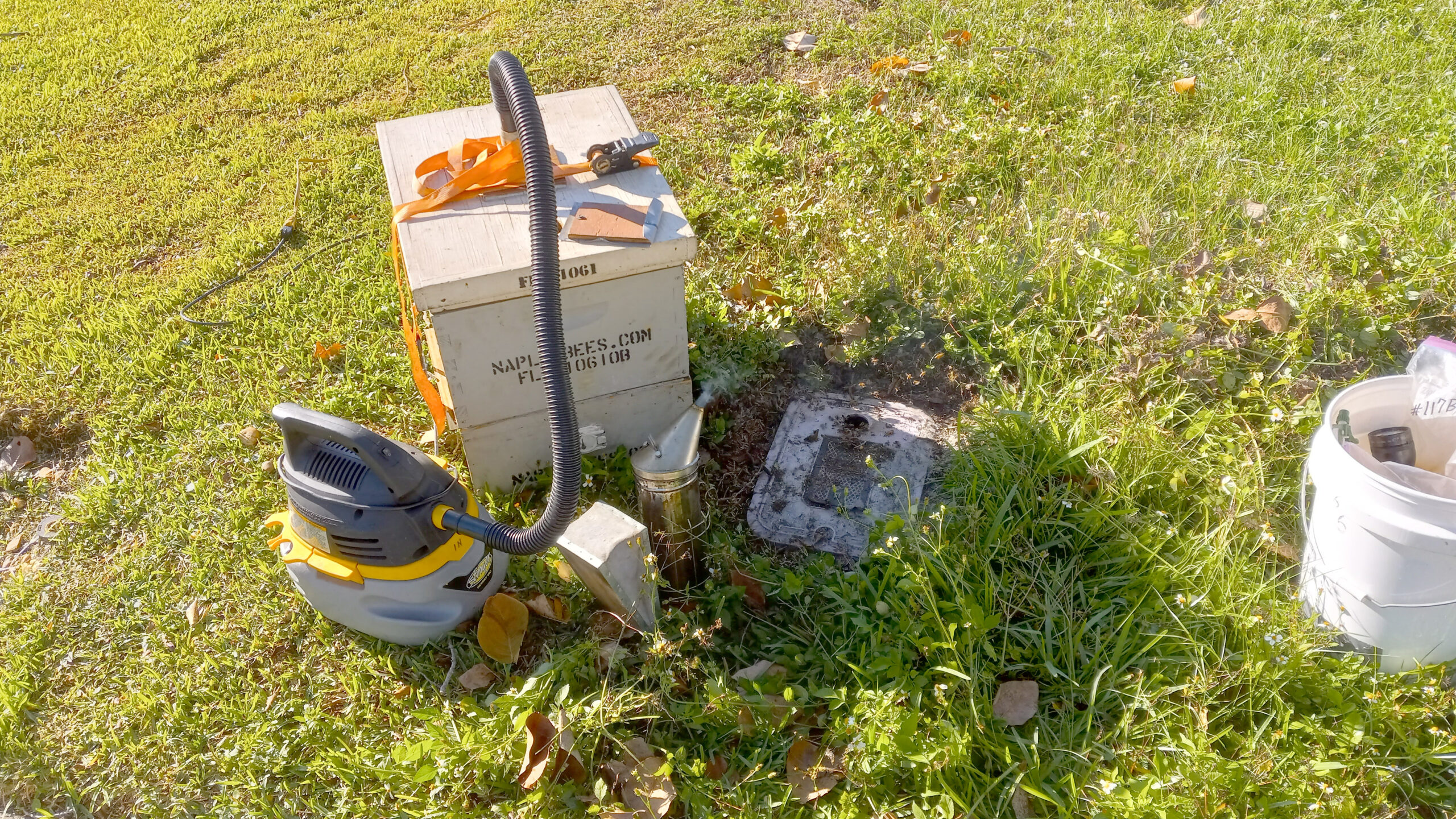 1/10/2026 – A small swarm was removed from a tree at a Countryside Drive, Naples, home. The beevac was used to slowly remove the bees as the queen was spotted and caged. The bees were put in the apiary later along with a sugar water frame feeder to help them get started building comb.