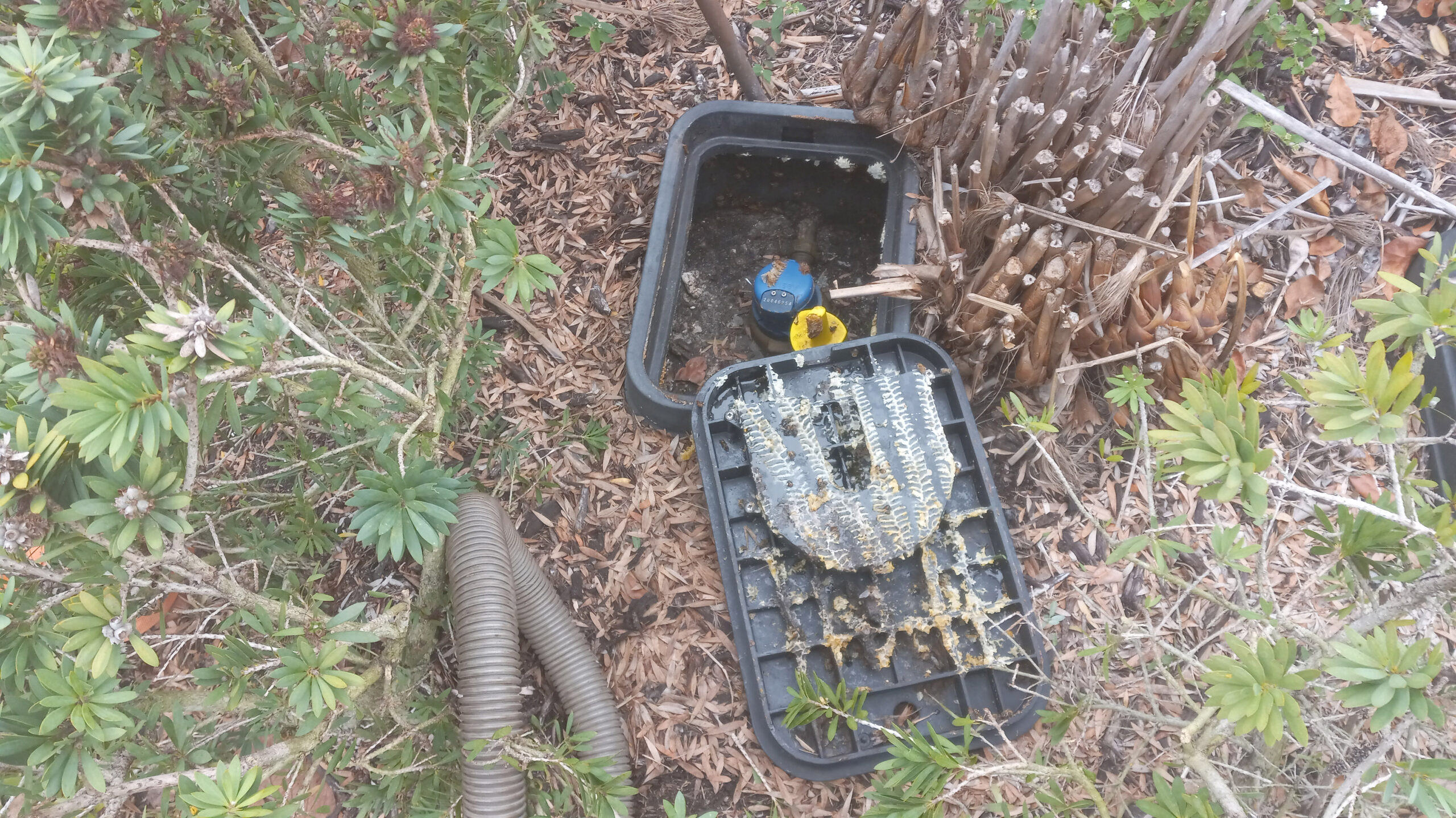 3/17/2026 – A very large hive was removed from a water meter on Peppertree Way in Naples. All the comb was cut out and rubber band frame mounted in to a brood box. Remaining bees were beevaced in to the hive box that contained a sugar water frame and then transported to the apiary.