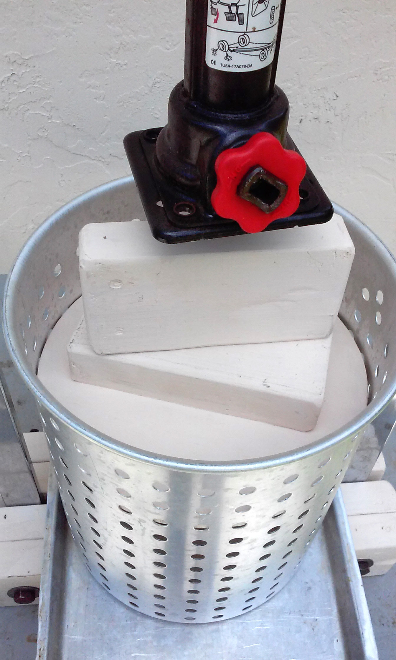| Above shows the plunger top and a spacer block ready to be squeezed by the jack. I found it most effective to advance the jack slowly until the honey starts to flow out of the strainer basket into the pan, let it rest for a minute, and then apply more pressure. Keep repeating this until at the very end, no more honey is coming out. It is amazing how “dry” of honey the circular block of compressed comb wax is once you are done. The resultant honey is completely free of a particles because of the use of the paint strainer bag and the honey is ready for bottling. |